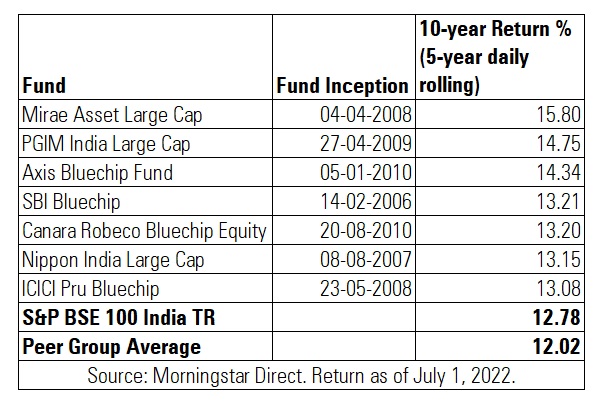 Of 27 funds that have completed ten years in the Large Cap category, only seven have outperformed over a ten-year period. The S&P BSE 100 India TRI delivered 12.78% during the same period while the average peer group return of Large Cap Funds stood at 12.02%.