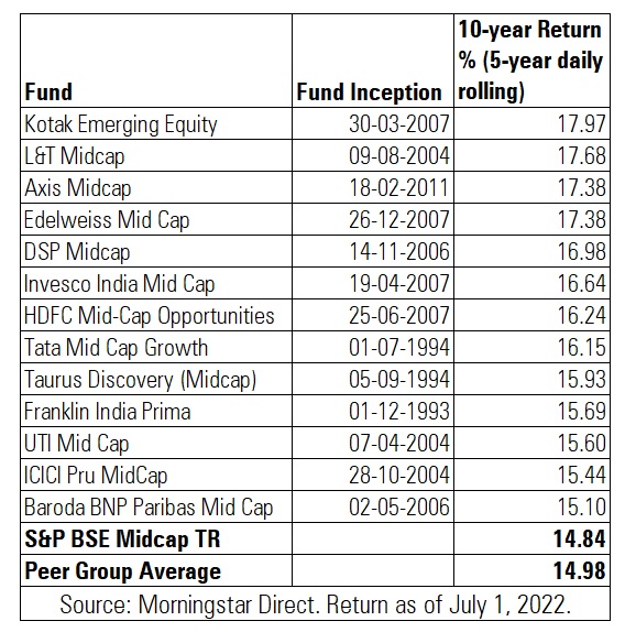 Mid Cap funds fared better as compared to Large Caps. Of 18 funds that have completed ten years as of July 1, 2022, 72% or 13 funds have outperformed the S&P BSE Mid Cap TRI. Kotak Emerging Equity has been the top performer in this category, beating the index and peer group. The fund delivered 17.97% CAGR versus 14.84% by the index and 14.98% by the peer group average.