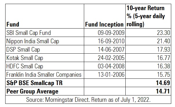 Of 11 funds that have completed ten years as of July 1, 2022, 55% or 6 funds have beaten the S&P BSE Small Cap TRI. SBI Small Cap Fund has been the top performer. It delivered 23.30% CAGR over a ten-year period while the BSE Small Cap delivered 14.69%.