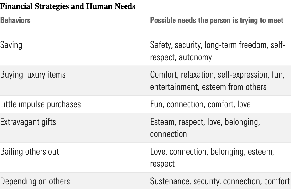 Everything we do with our money, whether we’re paying a bill, investing in a fund, or buying something on impulse, is an attempt to meet a fundamental human need. Our needs are universal and shared by all people everywhere (for example, sustenance, security, connection, esteem, autonomy, and meaning), but the strategies we employ vary from person to person depending on many factors.