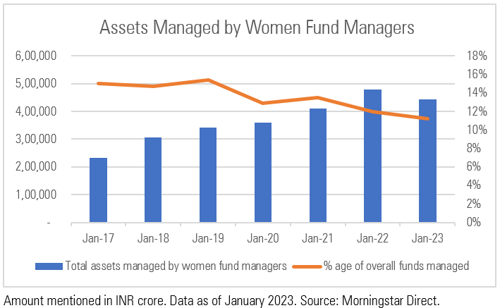 Since 2017, we have continuously witnessed a rise in the total assets managed by women. So it was not pleasant and very surprising to see the trend reverse last year. The decline in total assets managed by women as of January 2023, in comparison with the previous year, could be attributed to the exit of two prominent players - Swati Kulkarni (UTI Mutual Fund) and Lakshmi Iyer (Kotak Mahindra Mutual Fund).