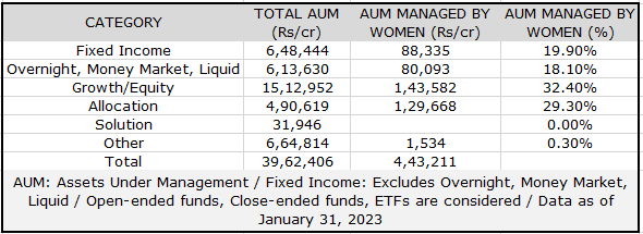 2023: 42 women fund managers. Constitute 9.81% of the industry. Cumulatively manage assets worth Rs 4.43 lakh crore.