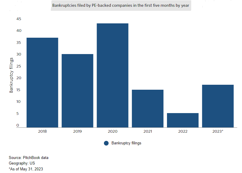 PitchBook data shows at least 18 PE-backed companies filed for bankruptcy in the U.S. during the first five months of 2023—the highest number since 2020. Some prominent names: