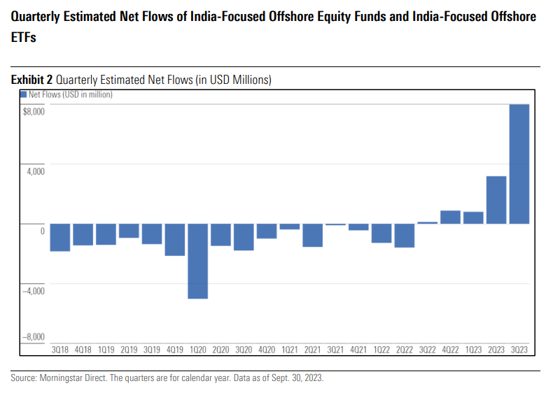 This is just a data point with respect to estimated flows and asset trends for offshore funds focused on the Indian equity market. An offshore India fund is one that is not domiciled in India but invests primarily in the Indian equity market. We have included the asset flows of mutual funds and exchange-traded funds (ETFs) with an allocation to Indian stocks as of September 2023.