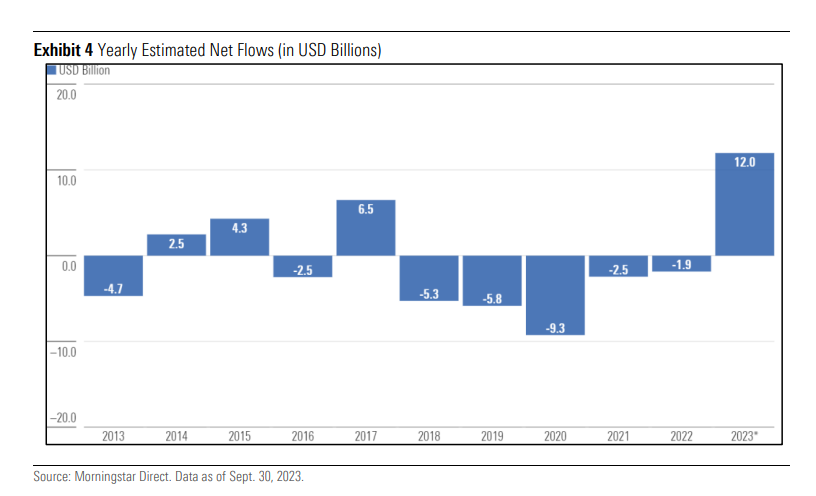 The category received a net inflow of $3.19 billion (June 2023 quarter), and $7.97 billion (September 2023 quarter). The latter is its highest to date over a quarterly period.